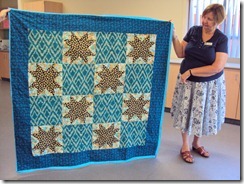 This photo does not do her quilt justice. When you enlarge it, you will see that it is made up of scrap strips of all sizes – and so cleverly put together. The GREAT thing about this quilt is that our Bronwyn will be teaching it in Bendigo – details of her classes and others are available on the Bendigo Yahoo group – please join!!! scqbendigo2013@yahoogroups.com