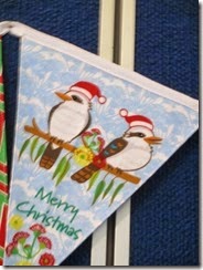 Here I am with my Emu cushion – to be given to my dear great-nephew – almost 2 – for his first Aussie Christmas. The fabric was purchased for me by Lynell at the Townsville retreat as a challenge for each of us to make something. The magnificent Christmas table runner, made for me by the lovely Ramona.